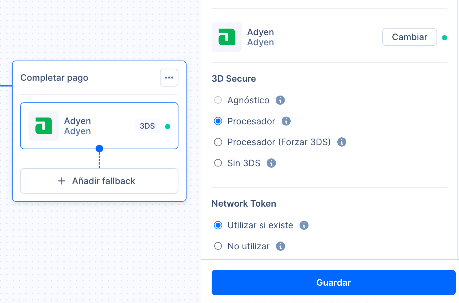 Desde la sección de orquestación, a la hora de crear el flujo de pago, simplemente hay que seleccionar el tipo de 3D Secure que se quiere activar:
